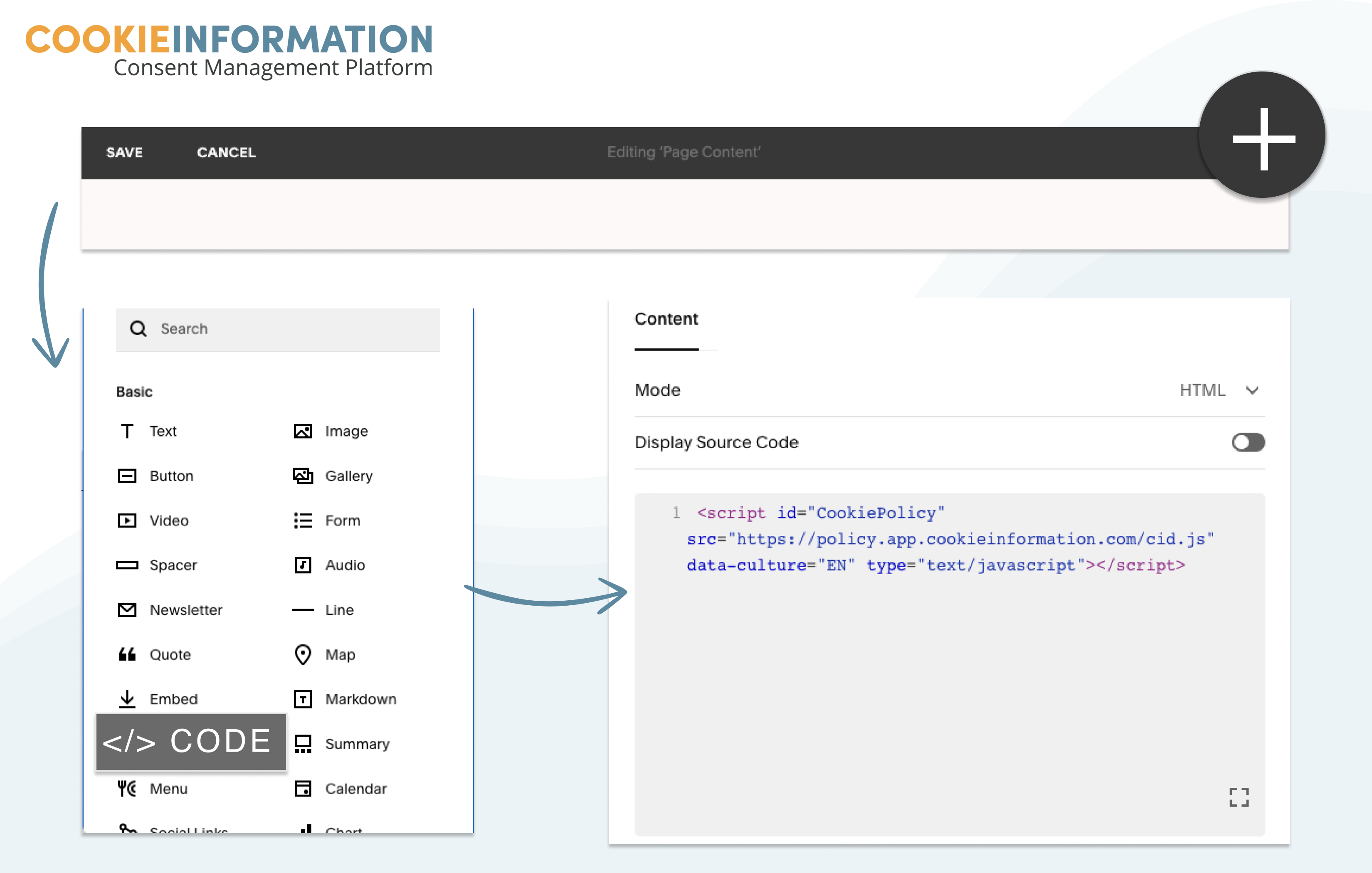- Add a new block and click on “+”. There choose “</> Code”.