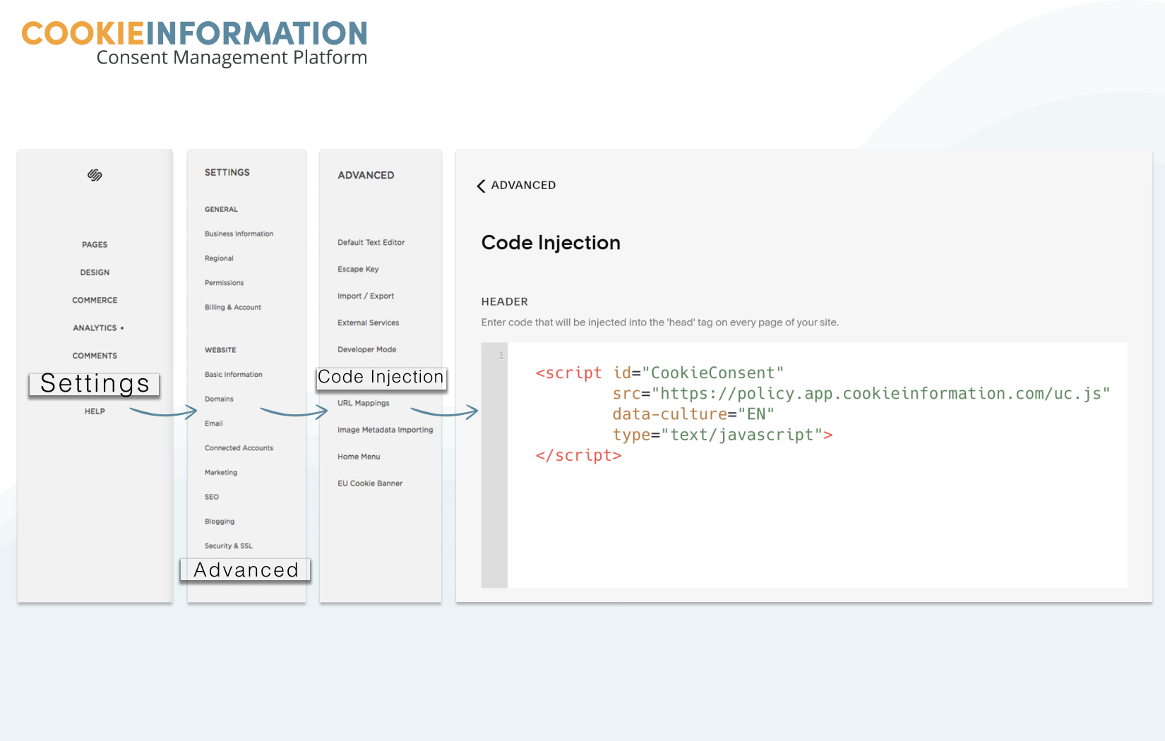 - Add the pop-up script into the header, Code Injection field. Code added here is injected into the <head> tag on every page on your site.