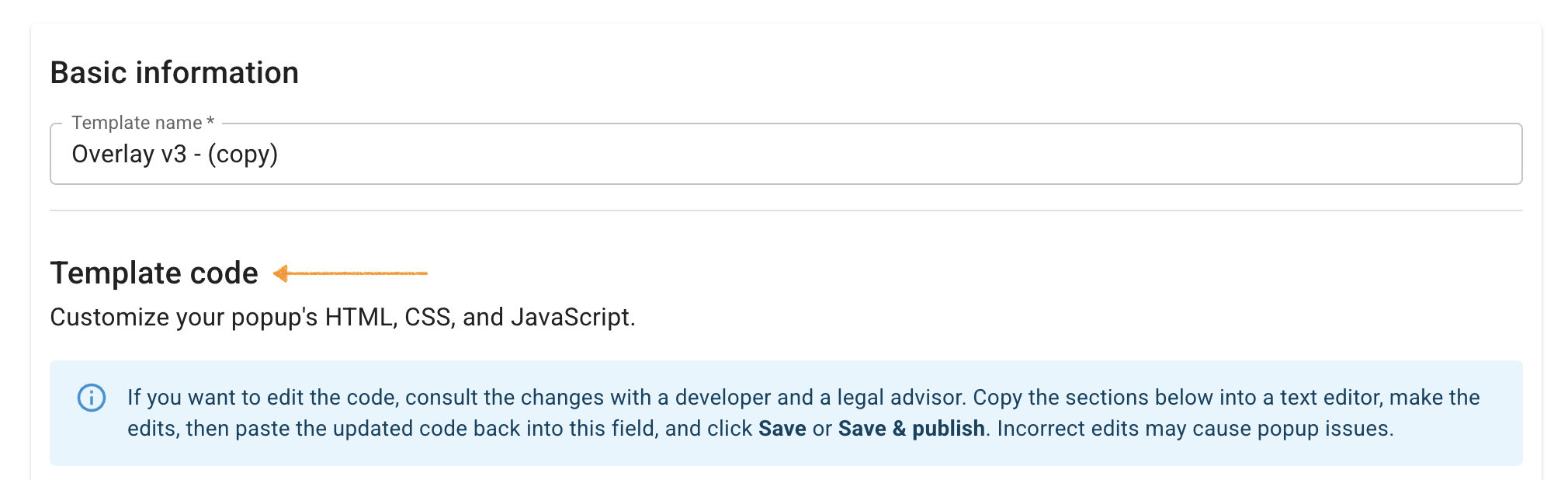 - When editing your template, it will revert to the default version. This means any changes you’ve made to the HTML, CSS, or JavaScript in Template code will be removed. We recommend copying the code first, updating the template, and then pasting the updated code into the new version.