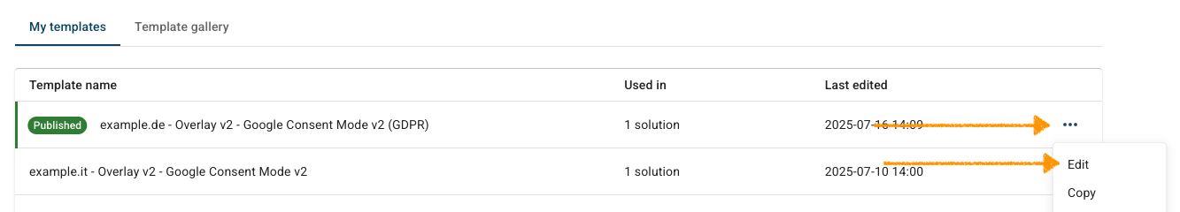 4. Click the ⋯ three-dot icon next to Overlay v2 – Google Consent Mode v2, and click Edit.