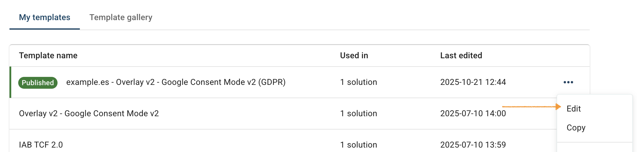 2. In Consent solutions, find the consent solution you want to update the consent popup template.