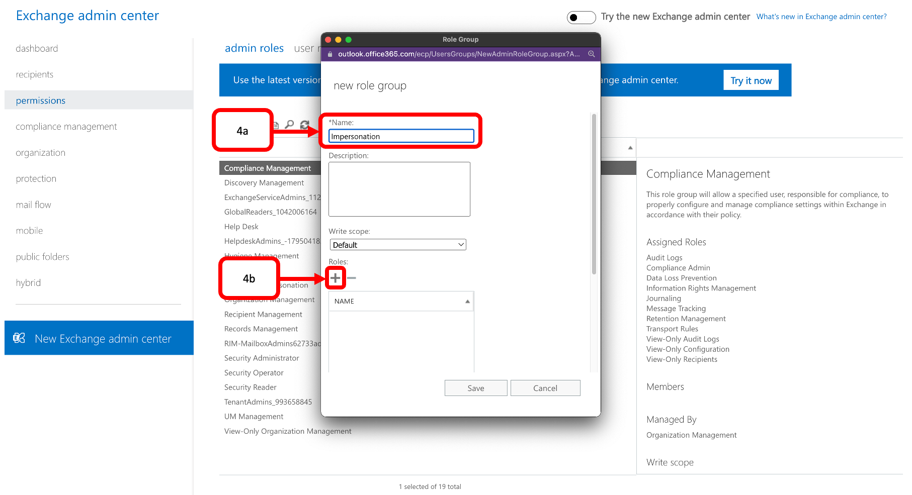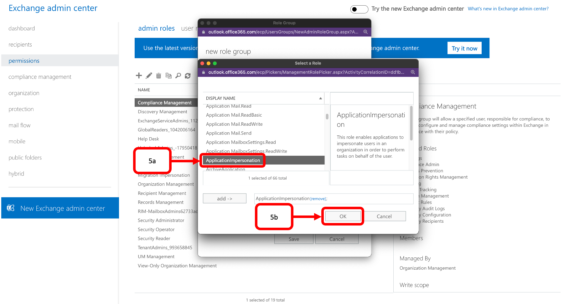 - Find ApplicationImpersonation in the list and double-click it(5a) and click OK(5b)