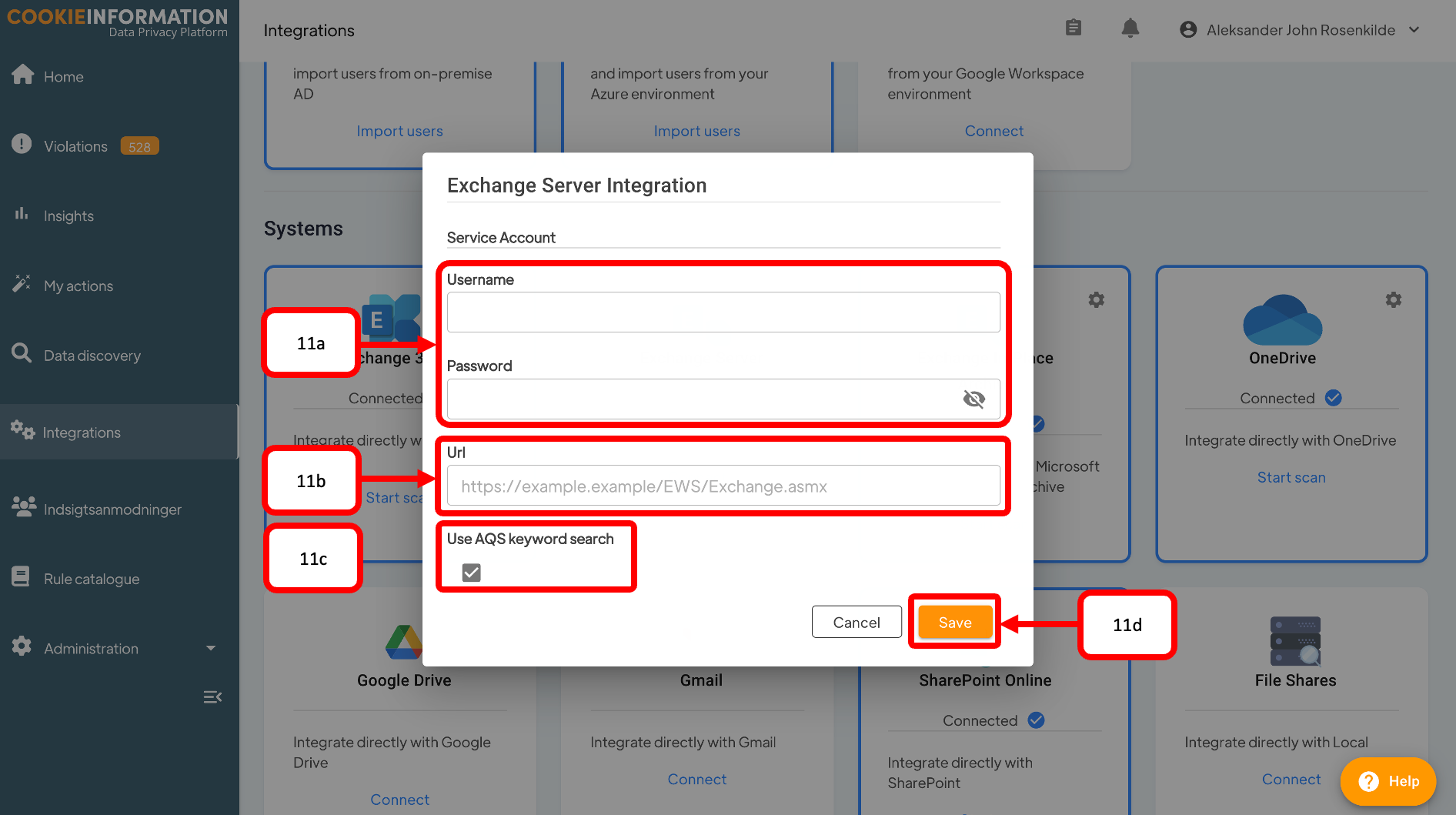 - Url(11b): Provide the EWS url for your Exchange server(11b) (https://<server name>/EWS/Exchange.asmx).