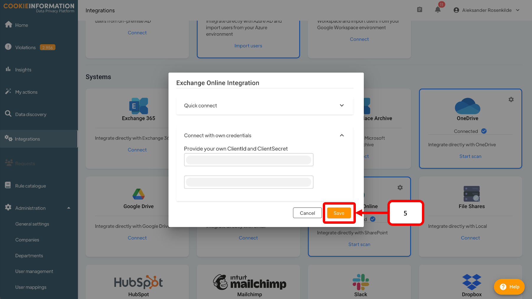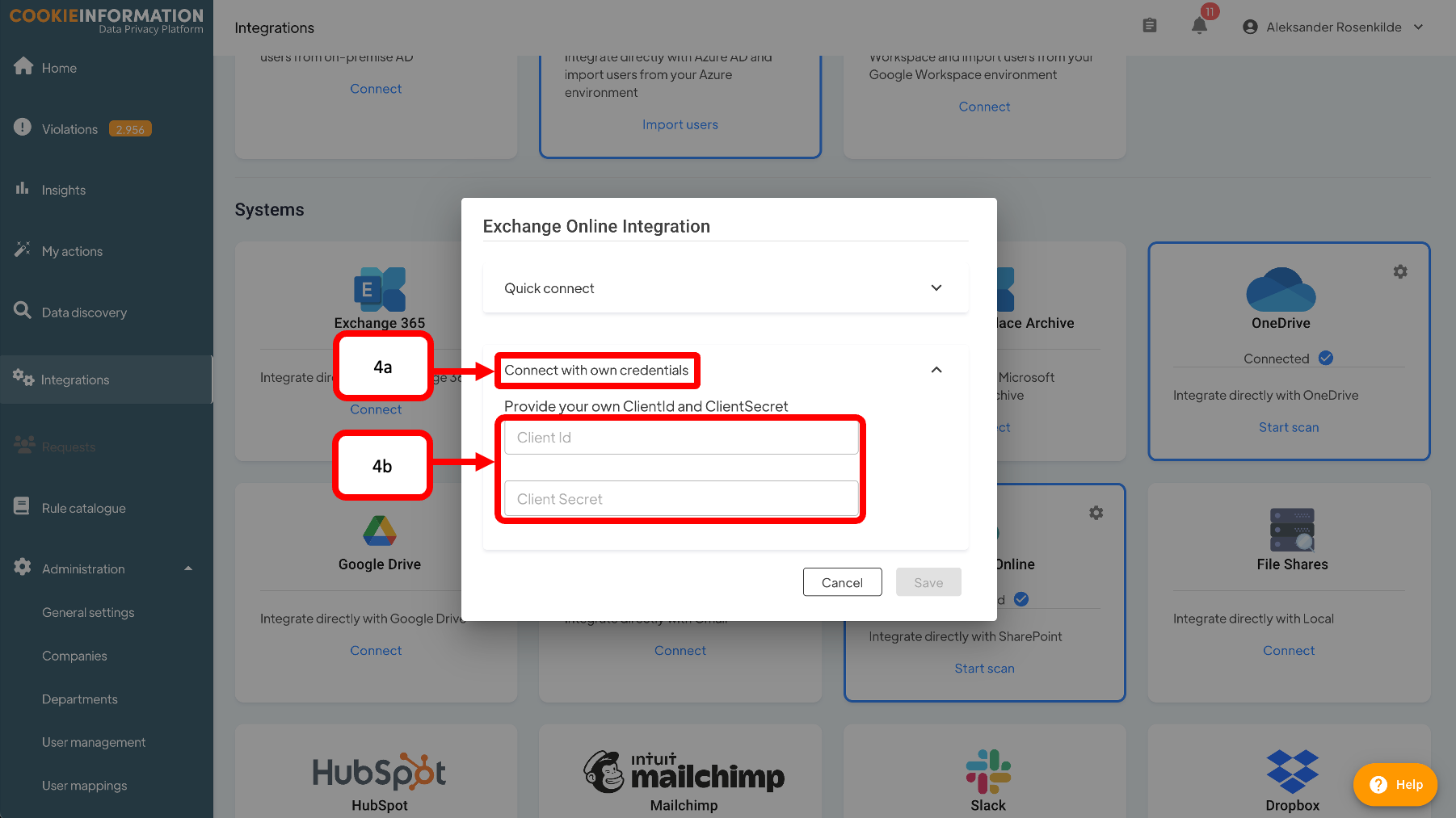 - Click Connect with own credentials(4a) and fill out Client Id and Client Secret of your Azure app(4b).