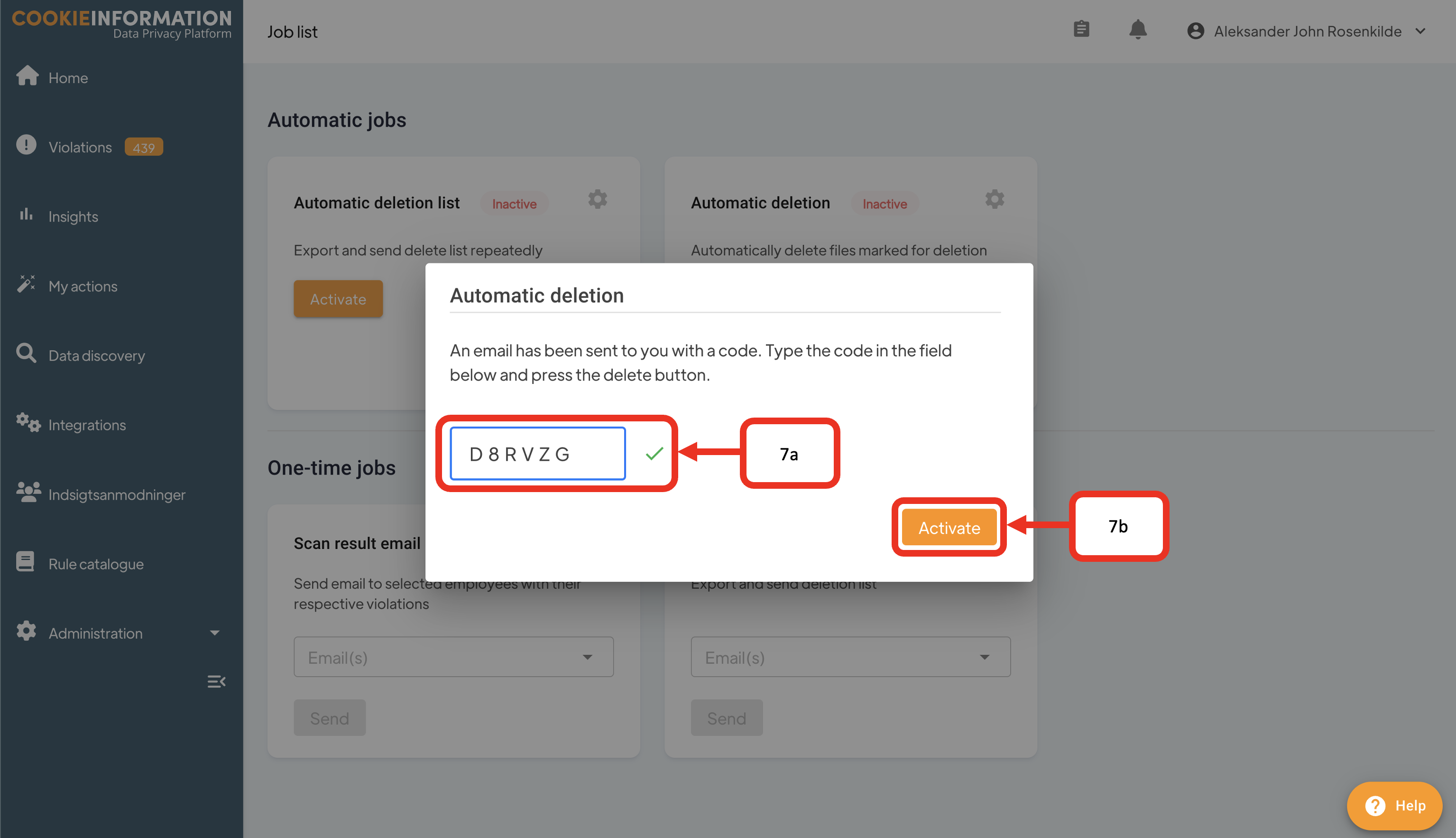 - Now a security code will be sent to the email address for the current user. Type in the code (7a) and click Activate (7b)