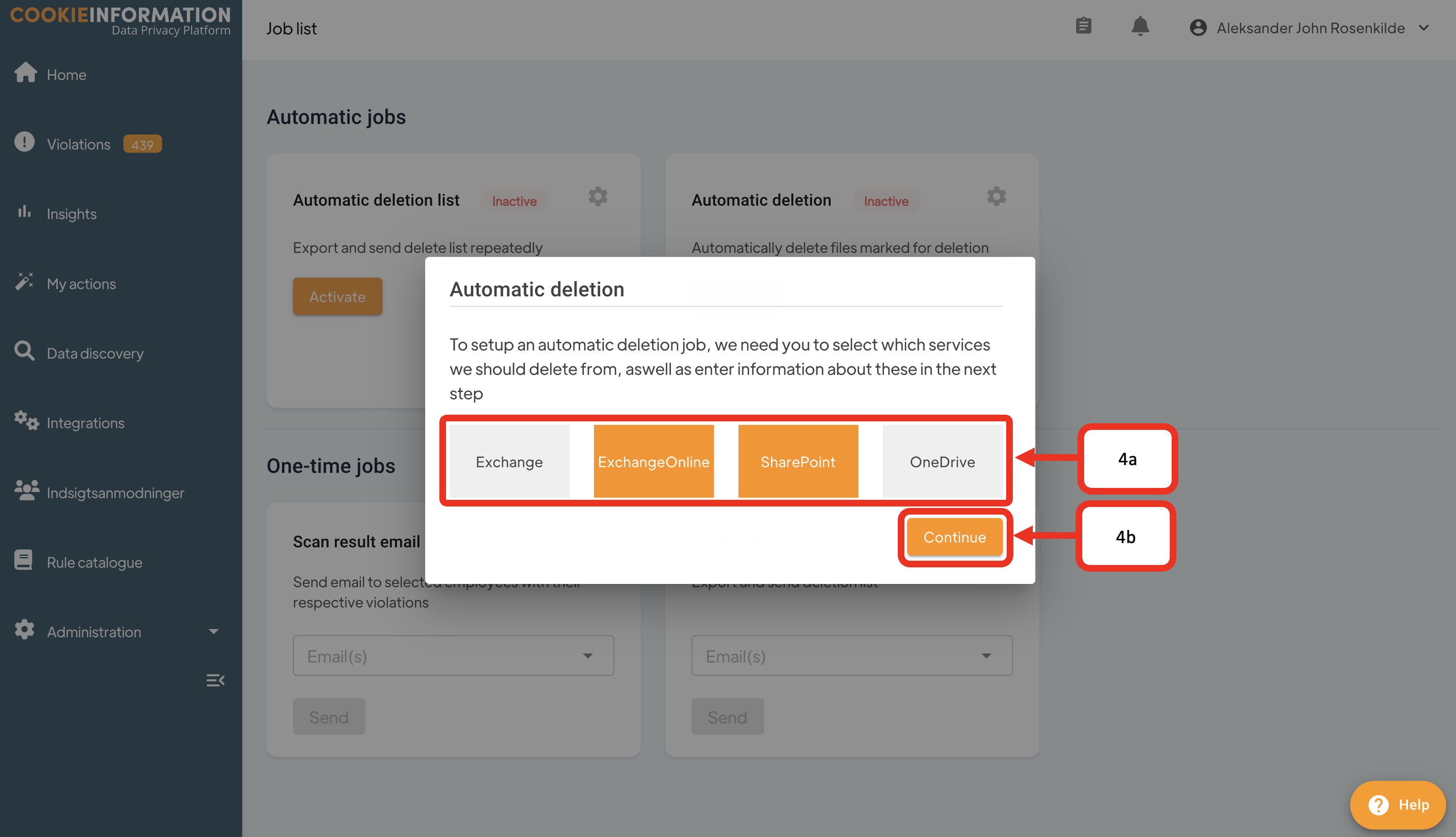 - Select the data sources you want to be included in the deletion job (4a) and click Continue (4b)