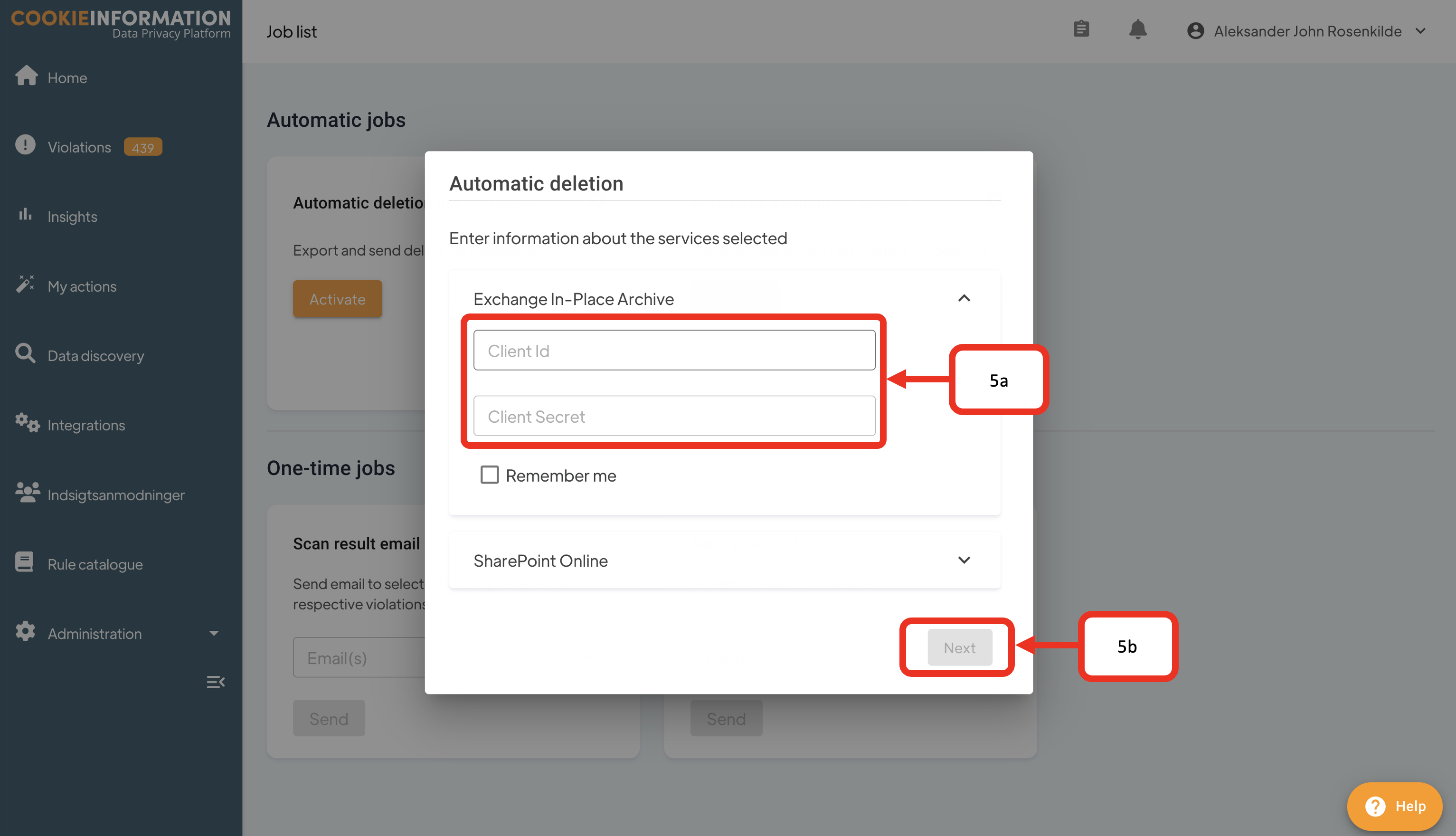 - Provide the Client Id and the Client Secret from your Azure app (5a). You can see how to find the Client Id and the Client Secret in step 9 and step 10 in guide on how to create an Azure app. Then click Next (5b)