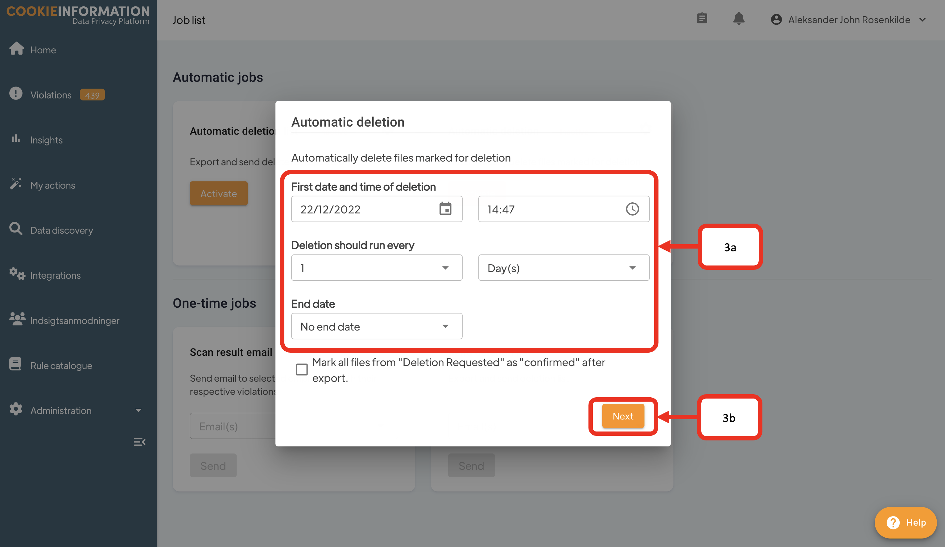- Select when and how frequent you want the deletion job to run (3a) and click Next (3b)