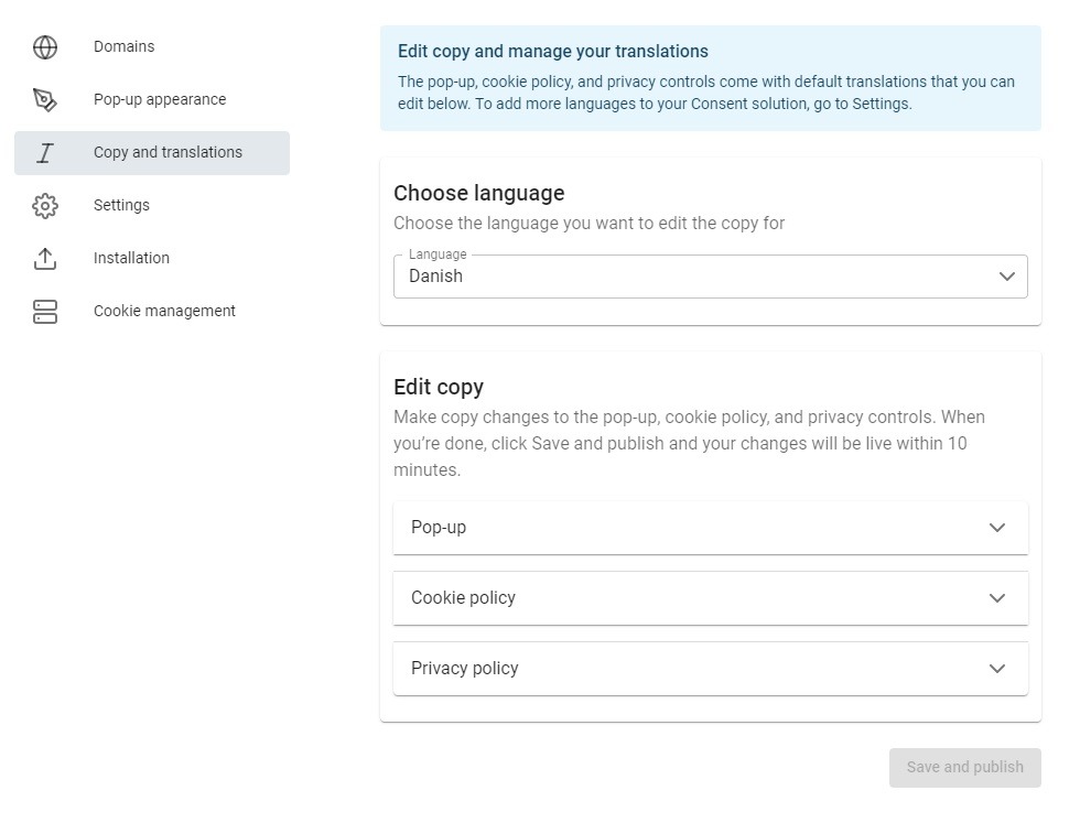 In order to make changes to the pop-up text, you can head to the platform, into your consent solution and to the pop-up tab. The text can be changed under the “Pop-up Text” section, as shown below.