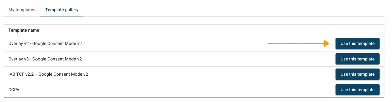 - Click Use this template next to Overlay v2 – Google Consent Mode v2 or Overlay v3 – Google Consent Mode v2.