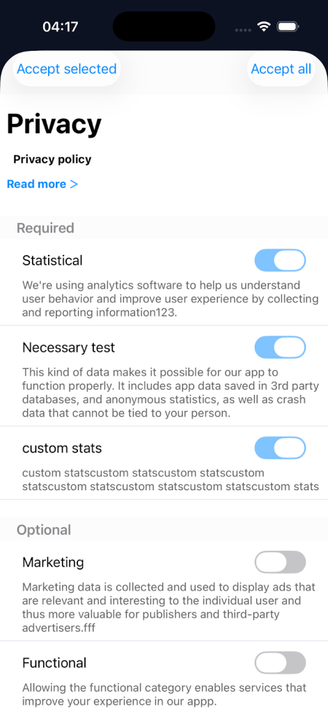 If the built-in UI doesn’t fit your app, you can build your own view. Use the methods below to fetch the consent solution and save the user’s choices.
