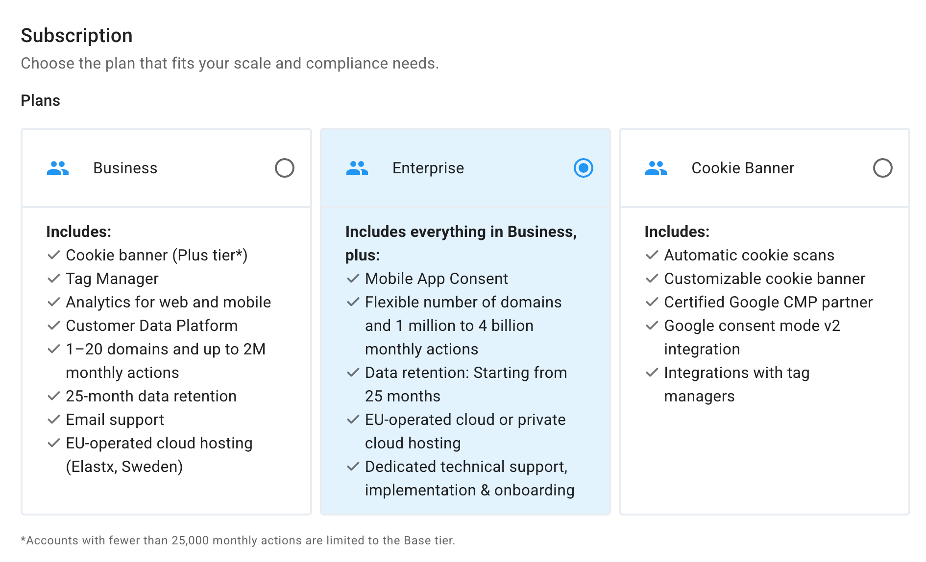 - Plans – Cookie Information offers three plans: Business, Enterprise, or Cookie Banner.
